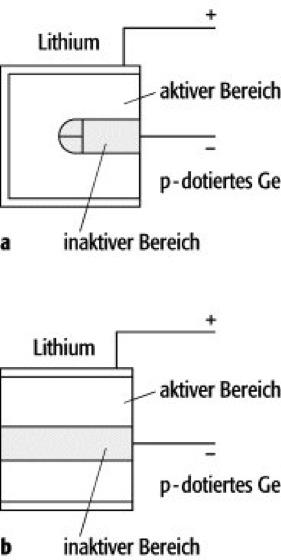 Ge(Li)-Detektor: a) Closed-End-Geometrie; b) True-Coaxial-Geometrie.