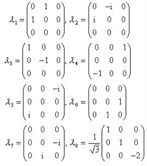 Gell-Mann-Matrizen, eine Basis der fundamentalen Darstellung der Gruppe SU(3) (Darstellung einer Gruppe), die dem Quarkmodell zugrunde liegt, als eine Verallgemeinerung der Isospin-SU(2). Die Gell-Mann-Matrizen sind gegeben durch