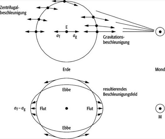 Gezeiten: Zusammenspiel von Zentrifugal- und Gravitationsbeschleunigung beim Entstehen der Ebbe- und Flutberge.