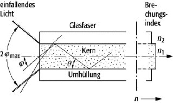 Glasfaser, aus Glas (häufig Quarzglas) gefertigter, zylindrischer Lichtwellenleiter zur Übertragung von Licht, z.B. in der Lichtnachrichtenübertragung oder Medizin. Um den für die Totalreflexion am Faserrand benötigten Brechzahlunterschied zu erzielen, sind Glasfasern meist mit einem Glas geringerer Brechzahl oder einem Kunststoff ummantelt. Der Übergang erfolgt bei Stufenindexfasern diskontinuierlich, bei den für die Übertragung von Signalen über große Entfernungen bevorzugten Gradientenindexfasern dagegen stetig. In Multimodefasern können mehrere Schwingungsmoden angeregt werden, sie haben Durchmesser zwischen 50 µm und 1 mm. Durch ihre großen Durchmesser sind sie relativ unproblematisch einzusetzen. Monomodefasern (single mode fibers) haben kleinere Kerndurchmesser, sind deutlich problematischer in der Benutzung, haben aber eine höhere Bandbreite und geringere Dämpfungsverluste.