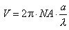 wobei a der Kernradius und λ die Wellenlänge des eingekoppelten Lichtes ist. Für eine Multimode-Stufenindexfaser ist die Zahl der Moden, die angeregt werden können, gleich V2 / 2, sie verhält sich also bei gegebener Wellenlänge wie eine Monomodefaser, wenn V< 2,405 ist.