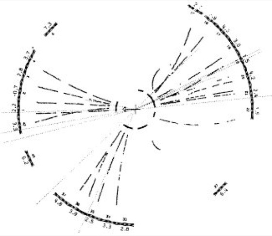 Hadron-Jets 1: Beispiel für ein Drei-Jet-Ereignis, das mit dem JADE-Detektor am e+e--Collider PETRA am DESY, Hamburg, aufgenommen wurde.