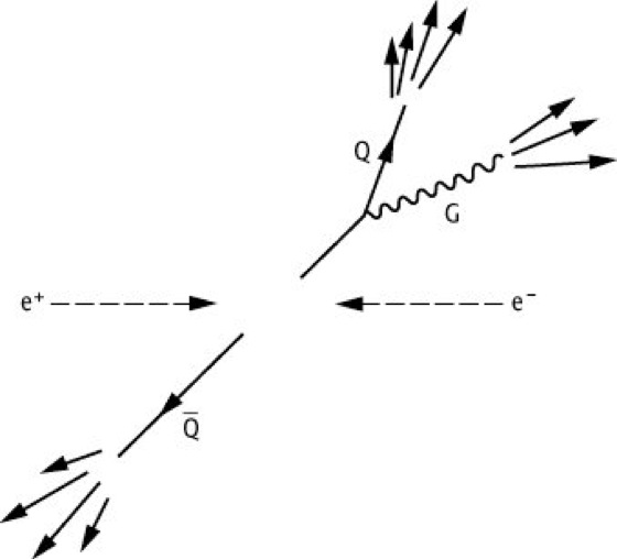 Hadron-Jets 2: Mikroskopische Deutung eines Drei-Jet-Ereignisses: Aus der Zerstrahlung des e+e--Paares entsteht zunächst ein Quark-Antiquark-Paar, das Quark strahlt danach ein Gluon (G) ab, das den dritten Jet bildet.