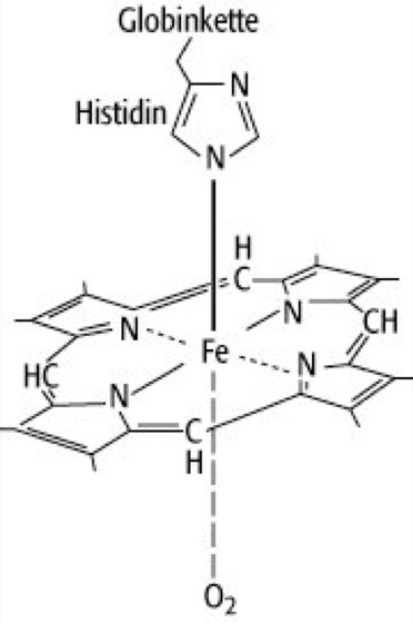 Häm-Gruppe: Anordnung und O2-Bindung der Häm-Gruppe im Hämoglobin.