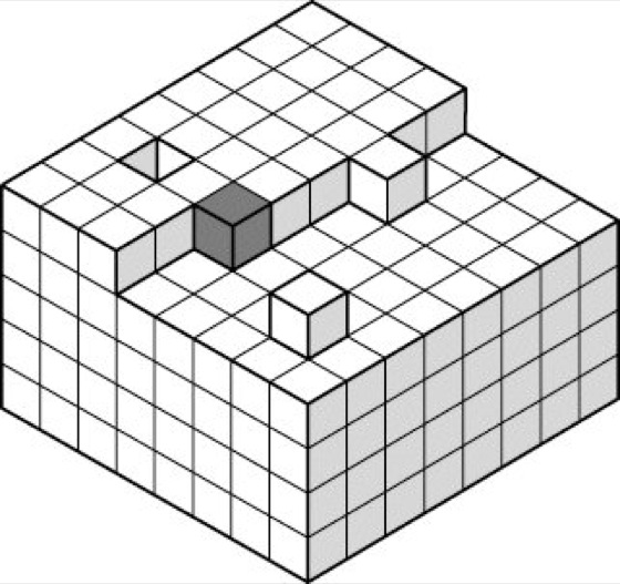 Halbkristallage im sog. Kossel-Modell, d.h. in einem kubisch primitiven Kristall, der aus würfelförmigen, mit ihren Nachbarn verbundenen Bausteinen besteht. Der markierte Baustein an der Kinke nimmt die Halbkristallage ein, er hat drei Nachbarbausteine.