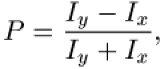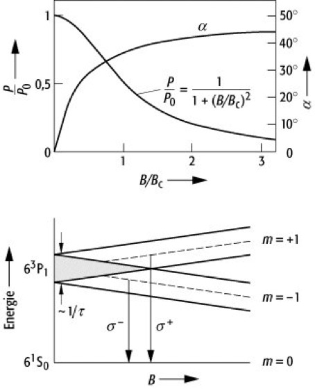 wobei Ix und Iy die Lichtintensitäten sind, deren elektrischer Feldvektor in x- bzw. y-Richtung oszilliert. Der Polarisationsgrad in Abb. 2 ist relativ zur Nullfeldpolarisation P0 aufgetragen. Ebenfalls aufgetragen ist der Drehwinkel α der Polarisation. Der Polarisationsgrad hat die Form einer Lorentz-Verteilung. Die Halbwertsbreite Bc ist ein für den entsprechenden Übergang charakteristischer Wert, für den gilt:
