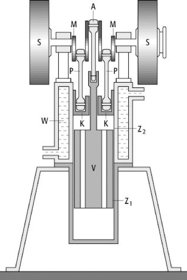Heißluftmaschine 1: A: Kurbelstange; K: Arbeitskolben; P: Kurbelstangen; S: Schwungräder; V: Verdrängerkolben; W: Wassermantel; Z1,2: Zylinder.