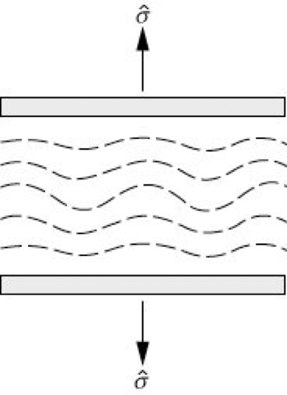 Helfrich-Effekt: Gefaltete Molekülstruktur einer smektischen Flüssigkeit infolge mechanischer Zugbeanspruchung σ.