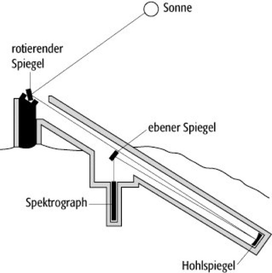 2)Astronomie: von einem Fernrohrantrieb bewegter, parallaktisch montierter Teleskop-Spiegel, der das Sonnenlicht trotz der Erddrehung ähnlich wie ein Coelostat immer in die gleiche Richtung lenkt (Abb. 2). Dort befindet sich zumeist ein fest installiertes Sonnenteleskop, etwa ein Turmteleskop.