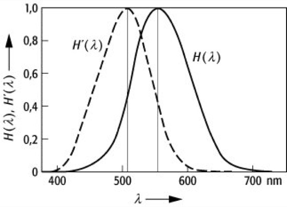 Hellempfindlichkeitsgrad, spektraler: Spektraler Hellempfindlichkeitsgrad des helladaptierter Auges (H(λ)) und des dunkeladaptierten Auges (H'(λ)).