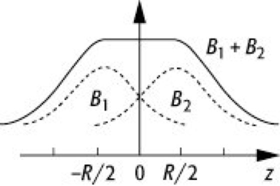 Helmholtz-Spulen 1: Zwei parallele Spulen mit gleichem Radius, deren Abstand gleich dem Radius ist, erzeugen ein annähernd homogenes Magnetfeld.