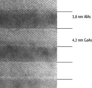 Heterostrukturen 1: Transmissionselektronenmikroskopische Aufnahme einer Halbleiterheterostruktur (abwechselnde Schichten von GaAs und AlAs). Man erkennt die Fortsetzung des Kristallgitters über die Materialgrenzen hinweg. Eine Folge mit vielen periodisch angeordneten Schichten unterschiedlicher Halbleitermaterialien wird auch als Übergitter bezeichnet.