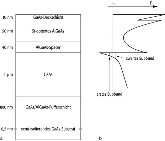 Unter Heterostrukturen oder Halbleiterheterostrukturen versteht man monokristallin aufeinander gewachsene Schichten von Halbleitern unterschiedlicher Zusammensetzung ( Abb. 1 ). Solche Schichtstrukturen zeigen eine Fülle von interessanten und technisch relevanten Quantisierungseffekten bezüglich ihrer elektronischen und optischen Eigenschaften und stellen eine wichtige Basis für die Herstellung neuartiger mikroelektronischer Bauelemente dar. Die wichtigste Materialkombination für die Herstellung von Halbleiterheterostrukturen ist das System GaAs/AlGaAs.