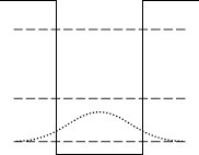 Heterostrukturen 3: Zulässige Energieniveaus (mit angedeuteter Wellenfunktion senkrecht zur Schicht im Grundzustand) der Bewegung senkrecht zur Schicht in einem Quantenfilm. Der hier unterstellte kastenförmige Potentialverlauf entspricht den Verhältnissen in einer sogenannten Doppelheterostruktur, bei der der Quantenfilm zwischen zwei Barrieren mit höherer Bandlücke eingegrenzt ist.
