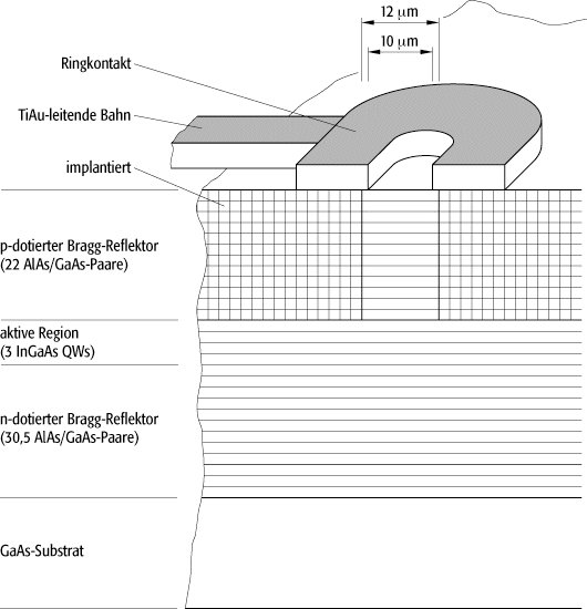 Die im vorangehenden Abschnitt vorgestellten Eigenschaften von Heterostrukturen werden vielfach bereits technisch genutzt oder bilden zur Zeit die Grundlage für das Design neuer Halbleiterbauelemente. Die Quantisierung der Elektronenenergie in Quantenfilmen erlaubt beispielsweise die Steigerung des Wirkungsgrads von Leuchtdioden und Halbleiterlasern, die Bragg-Spiegel bilden z.B. die Funktionsgrundlage des Vertical Cavity Surface Emitting Lasers (VCSEL, Abb. 4 ).