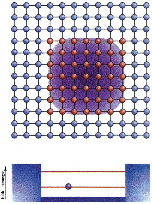 Heterostrukturen 5: Ein Quantenpunkt stellt die Realisierung eines dreidimensionalen Potentialtopfs für Ladungsträger dar. Diesen stehen deshalb nur einzelne, diskrete Energieniveaus zur Verfügung.
