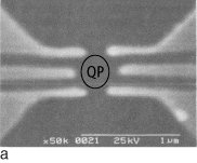 Weitere Effekte mit interessanten Anwendungsmöglichkeiten für Halbleiterheterostrukturen ergeben sich durch die Möglichkeiten zur lateralen Mikrostrukturierung solcher Systeme (beziehungsweise des in ihnen enthaltenen 2D Elektronengases). Diese ist unter anderem durch verschiedene Ätzverfahren (z.B. Plasma-Ätzen oder naßchemische Verfahren), durch Ionenimplantation und durch das Aufbringen von sogenannten ›Gate‹-Elektroden möglich. Auf diese Weise kann das in der Grenzfäche enthaltene Elektronensystem noch weiter auf eine Dimension (›Quantendraht‹) oder gar auf ein kleines, in alle Raumrichtungen beschränktes Volumen (›Quantenpunkt‹) eingeschränkt werden. Dadurch kommt es dann zu zusätzlichen Quantisierungserscheinungen (z.B. Abb. 5 ), die eine Veränderung der Zustandsdichten bewirken und wiederum auch für die Realisierung neuartiger elektronischer und optoelektronischer Bauelemente genutzt werden können, beispielsweise für sogenannte Einzelelektrontransistoren ( Abb. 6 : Aufbau und ›Kennlinie‹), bei denen das Zusammenspiel von Quantisierunsgeffekten und elektrischer Abstoßung zwischen den Elektronen ausgenutzt wird. Derzeit funktionieren diese Einzelelektronenbauelemente aber nur bei tiefen Temperaturen. Für einen Einsatz bei Raumtemperatur müssen die Strukturen noch weiter verkleinert werden, dann erst wird die Energie der Coulomb-Blockade so groß, daß die Elektronen sie nicht mehr durch das thermische Rauschen überwinden können.