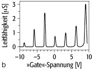 Heterostrukturen 6: Durch ›Gate‹-Elektroden definierter Quantenpunkt (a) und Leitfähigkeitsverhalten (b) in Abhängigkeit der Steuerspannung. Die breiten Leitfähigkeitsminima sind eine Folge der Coulomb-Blockade.