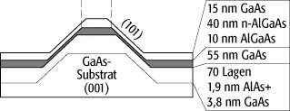 Heterostrukturen 4: Schichtaufbau eines Oberflächenemittierenden Halbleiterlasers. Die Spiegel des Resonators sind als Bragg-Spiegel wirkende Halbleiterübergitter.
