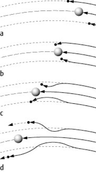Hirtenmonde 1: Die charakteristischen Bänder und Lücken im Ringsystem des Saturn können durch die Gravitationswirkung kleiner Monde entstehen. Wenn ein kleiner Mond und zwei Ringteilchen einen Planeten umkreisen (a), dann bewegt sich das innere Teilchen schneller als der Mond und dieser wiederum schneller als das äußere Teilchen. Das innere Teilchen holt den Mond ein und überholt das äußere (b); dabei werden die Teilchen durch die Gravitation an den Mond herangezogen (c), und die Bahnen der Teilchen sind versetzt (d).