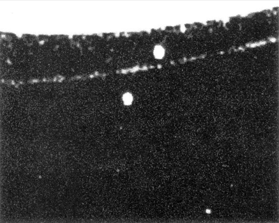 Hirtenmonde 2: Photo der Raumsonde Voyager, das die beiden Hirtenmonde Prometheus und Pandora zu beiden Seiten des F-Rings des Saturns zeigt.