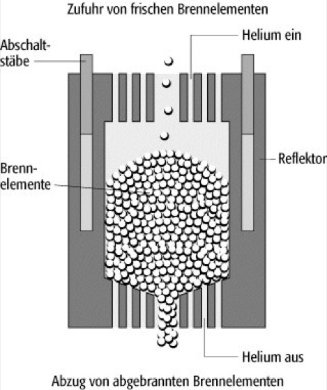 Der in Deutschland entwickelte Hochtemperaturreaktor basiert auf dem Prinzip des Kugelhaufenreaktors, bei dem der Kernbrennstoff in mm-große geschichtete Kügelchen aus pyrolythischem Kohlenstoff und Siliziumcarbid (SiC) eingebettet ist. Die Brennelemente werden ebenfalls in Kugelform ausgelegt, wobei die Brennstoffkügelchen in Graphitkugel eingebettet werden. Das Graphit dient als Moderator, zur Kühlung wird gasförmiges Helium verwendet. In dem Thorium-Hochtemperaturreaktor (THTR), der bis 1989 bei Hamm/Uentrop (Westfalen) betrieben wurde, kamen 360 000 Brennelementkugeln mit einem Durchmesser von 6 cm, 280 000 Graphitkugeln (zusätzlicher Moderator) und 35 000 borhaltige Kugeln (Absorber) zum Einsatz. Die Auslegung als Hochtemperatur-Kugelhaufenreaktor erlaubt das Erreichen eines negativen Reaktionskoeffizienten sowie einer ausreichenden Wärmeabfuhr auch im Falle des Versagens der aktiven Kühlsysteme, wodurch die Reaktortemperaturen auf max. 1600 °C begrenzt bleiben. Allerdings führten die hohen Betriebstemperaturen zu verschiedenen sekundären technischen Schwierigkeiten, so daß der Reaktor in Hamm/Uentrop 1989 wegen Sicherheitsbedenken und Unwirtschaftlichkeit geschlossen wurde.