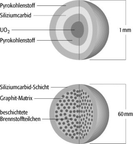 Hochtemperaturreaktor 2: Oben: Aufbau eines Brennstoffkügelchens beim Hochtemperatur-Kugelhaufenreaktor; unten: Aufbau eines Brennelements beim Hochtemperaturreaktor.
