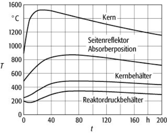Hochtemperaturreaktor 3: Temperaturverläufe im Core von Hochtemperatur-Kugelhaufenreaktoren als Funktion der Zeit beim Ausfall der aktiven Kühlsysteme. Man erkennt, daß auch im Kern eine Temperatur von 1600 °C, bei der die Beständigkeit der verwendeten Materialien noch gewährleistet ist, nicht überschritten wird. Die Wärmeabfuhr erfolgt selbsttätig durch Leitung, Konvektion und Strahlung.
