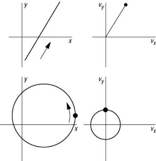 Hodograph 1: Die geradlinig gleichförmige Bewegung wird als Punkt im vx-vy-Diagramm dargestellt. Der Hodograph der gleichförmigen Kreisbewegung ist ein Kreis um den Ursprung, der mit der Phasendifferenz von -π / 2 zur Kreisbewegung durchlaufen wird.