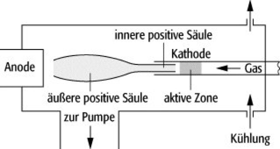 Hohlkathodenentladung, spezielle Form der Gasentladung. Dabei brennt eine Gleichstromentladung in der Atmosphäre eines inerten Gases bei einigen mbar zwischen einer ringförmigen Anode und einer Kathode, in die ein Loch von typischerweise 5 mm Durchmesser und Tiefe gebohrt ist. Diese Konfiguration wird sowohl für die Glimmentladung als auch für die Bogenentladung verwendet. In der Hohlkathoden-Glimmentladung wird das negative Glimmlicht weitgehend von der Kathodenoberfläche umschlossen, was zu einer verstärkten Elektronenauslösung aus der Kathode führt. Das Prinzip der Hohlkathoden-Bogenentladung ist in der Abb. dargestellt. Durch ein Metallröhrchen mit hohem Schmelzpunkt strömt ein Gas in eine Vakuumkammer. Im Inneren des Röhrchens brennt eine stromstarke Entladung (10-500 A). Der heißeste Bereich, die sog. aktive Zone, befindet sich im Abstand einiger Durchmesser vom Ende des Röhrchens. Dort werden die meisten Ladungsträger durch Glühemission aus dem Röhrchen gebildet. Charakteristisch für die Hohlkathodenentladung ist das Hineingreifen der positiven Säule in die Kathode, man spricht von innerer und äußerer positiver Säule.