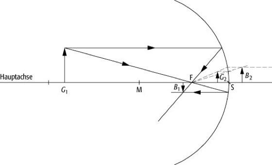 bildet die Hauptachse des Systemes. Mit sphärischen Spiegeln können sowohl reelle als auch virtuelle Bilder erzeugt werden. Bei achsnahen Strahlen besteht zwischen der Bildweite b = x′ + f und der Gegenstandsweite g = x + f folgende Beziehung (Abbildungsgleichung des Hohlspiegels):