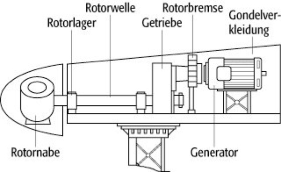 Horizontalachsenkonverter 1: Schema eines Horizontalachsenkonverters. Die Rotation der Rotorwelle wird über ein Getriebe direkt zum Antrieb eines Generators benutzt.