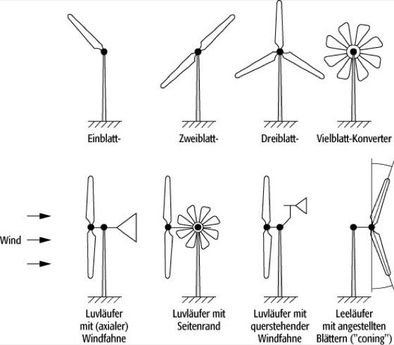 Horizontalachsenkonverter 2: Verschiedene Bauformen von Horizontalachsenkonvertern. Traditionelle Windmühlen verwenden Vielblattrotoren mit geringer Rotordrehzahl und geringer Effizienz bei relativ großem Anlaufdrehmoment. Moderne hocheffiziente Windkonverter verwenden demgegenüber nur ein bis drei Rotorblätter und arbeiten bei hohen Rotordrehzahlen; das Anlaufmoment ist hier allerdings i.a. klein, so daß mitunter eine Anlaufhilfe benötigt wird.