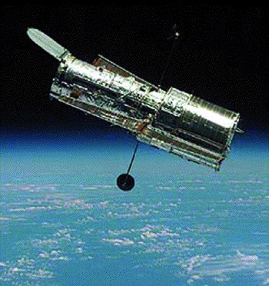 Hubble-Weltraumteleskop, HST (Hubble Space Telescope), am 24.4.1990 mit der Weltraumfähre Discovery in eine 590 km hohe Erdumlaufbahn gebrachtes 2,2-m-Teleskop für den Bereich vom nahen Ultraviolett bis nahen Infrarotbereich. Das HST ist ein Projekt der NASA, zu dem die Europäische Weltraumbehörde, ESA, eine Kamera beigesteuert hat. Das HST blieb zunächst weit hinter den Erwartungen zurück, weil der Hauptspiegel aufgrund eines Herstellungsfehlers eine sphärische Aberration besaß. Mit Hilfe bildverarbeitender Techniken ließen sich die Aufnahmen im Computer bis zu einem gewissen Grade restaurieren. 1993 wurde das HST in der Erdumlaufbahn repariert. Danach erreichte es seine erhoffte Qualität. Die Aufnahmen sind beugungsbegrenzt und erzielen im sichtbaren Spektralbereich eine Auflösung von ca. 0,05 Bogensekunden. Bei einer weiteren Service-Mission im Februar 1997 wurden neue Detektoren eingebaut.