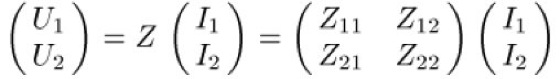 Impedanzmatrix, Widerstandsmatrix, eine 2×2-Matrix Z, die den linearen Zusammenhang zwischen Eingangs- und Ausgangsspannung und -strom bei einem linearen passiven Vierpol beschreibt: