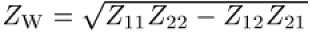 Dabei sind U1 die Eingangs-, U2 die Ausgangsspannung, I1 der Eingangs- und I2 der Ausgangsstrom. Die Zij sind die jeweiligen komplexen Wechselstromwiderstände (Impedanz). Die Impedanzmatrizen zweier in Reihe geschalteter Vierpole addieren sich. Die Diagonalelemente Z11, Z22 heißen primärer bzw. sekundärer Leerlaufwiderstand. Weiterhin gilt bei passiven Vierpolen Z12 = – Z21; Z21 heißt Kern- oder Kopplungswiderstand. Die Wurzel aus der Determinanten von Z ist der mittlere Wellenwiderstand
