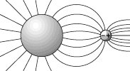 Influenz 2: Durch die influenzierten Ladungen auf der kleinen Kugel wird das ursprünglich punktsymmetrische Feld der großen geladenen Kugel verzerrt.