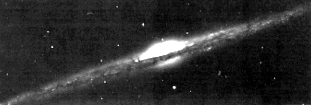 interstellare Materie 2: Galaxie NGC 4565 im Virgo-Haufen. Die Dunkelwolken sind über die ganze Scheibe verteilt deutlich sichtbar. In der Mitte liegt die helle HII-Region.