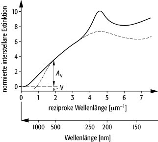 Die Streuung des Lichts in einer Staubwolke führt jedoch nicht nur zu einer Schwächung, sondern auch zu einer Verfärbung des Lichts. Aufgrund der Größe der Staubteilchen ist die Streuung wellenlängenabhängig, wobei gemäß dem Rayleigh-Gesetz kurzwelliges Licht stärker geschwächt wird als langwelliges Licht. Dies führt zu einer Rötung des Lichts von weit entfernten Sternen, die durch den Vergleich der Spektren eines verfärbten und eines nicht verfärbten Sterns ermittelt werden kann. Der daraus bestimmte Farbexzeß ist entfernungsabhängig, da die Rötung um so stärker ist, je weiter der Sehstrahl durch den interstellaren Staub führt. Man muß daher zunächst alle gemessenen Farbexzesse auf gleiche Teilchenzahlen umrechnen und erhält so die interstellare Verfärbungskurve, die den allgemeinen Verlauf der Streuung wiedergibt (siehe Abb. 3 ). Diese Kurve weist im Ultraviolettbereich ein deutliches Extinktionsmaximum bei etwa 220 nm auf, das von länglichen Siliziumnadeln hervorgerufen wird, und fällt im optischen Bereich nahezu linear ab. Im Infrarotbereich befinden sich zudem eine Reihe von Absorptionslinien und -banden.