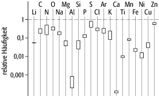 Die chemische Zusammensetzung des interstellaren Gases entspricht weitgehend der allgemeinen kosmischen Elementhäufigkeit, wobei jedoch lokale Abweichungen möglich sind (siehe Abb. 4 ). Ausnahmen bestehen besonders da, wo neben Gas auch große Staubmengen vorliegen.