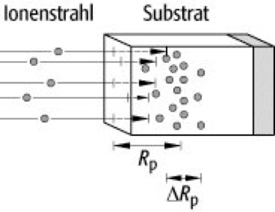 Ionenreichweite 1: Schematische Darstellung der Implantation von Ionen in Festkörpern; Rp: mittlere projizierte Reichweite, ΔRp: Reichweitenverteilung.
