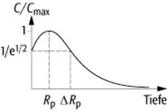 Ionenreichweite 2: Tiefenverteilung der Implantation von Ionen in Festkörpern; C / Cmax: normierte Konzentration, Rp: mittlere projizierte Reichweite, ΔRp: Reichweitenverteilung, 1 / e1 / 2: normierte Konzentration bei ΔRp.