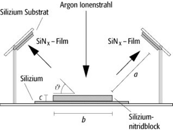 Ionenstrahlzerstäubung: Schematische Darstellung der Filmherstellung mittels Ionenstrahlzerstäubung. a ist der Abstand zwischen Target und Substrat, ϑ der Winkel dazwischen; b und c sind Breite und Dicke des Substrats.