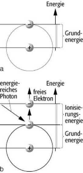 Ionisation: a) Atom im Grundzustand, b) Photoionisation des Atoms.