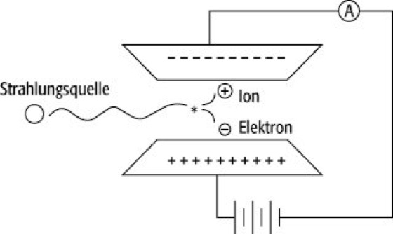 Ionisationszähler, Ionisationskammer, dient der Messung der durch einen Teilchendurchgang in einem Detektorvolumen (Kammer) erzeugten primären Ionisation. Gleichzeitig kann auch eine Ortsbestimmung durchgeführt werden. Die einfachste Form einer solchen Kammer besteht aus einer Anode und einer Kathode, die ein Volumen umschließen (Prinzip des Plattenkondensators) und mit einem Gas (z.B. Luft oder Argon) gefüllt sind (siehe Abb. 1).