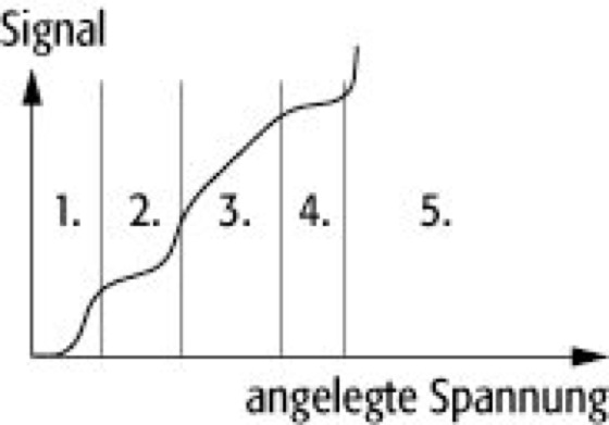 Ionisationszähler 2: Abhängigkeit der Signalstärke von der angelegten Spannung bei Gasdetektoren. Man kann im Verlauf des Graphen verschiedene Phasen unterscheiden: 1. Rekombination, 2. Ionisation, 3. Proportionalbereich, 4. Geiger-Müller-Bereich, 5. ständige Entladung.