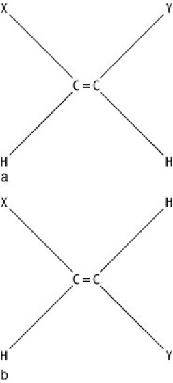 Isomerie, 1)Chemie: Vorhandensein von chemischen Verbindungen, deren Moleküle zwar aus denselben Atomen bestehen, aber verschiedene Eigenschaften haben. Isomere Verbindungen unterscheiden sich durch die Anordnung der Atome. Z.B. unterscheiden sich die cis- und die trans-Form durch die Stellung von Substituenten. Die trans-Form besitzt im Gegensatz zu der cis-Form auf Grund ihrer Symmetrie bei zwei gleichen Substituenten kein Dipolmoment. Ist ein Teil eines Moleküls mit einem anderen Teil durch eine Einfachbindung verbunden, so sind beide Teile gegeneinander drehbar. Es besteht dann kein Unterschied zwischen cis- und trans-Verbindung. Dagegen sind die cis- und trans-Verbindungen in Abb. 1 wegen der Doppelbindung voneinander verschieden.