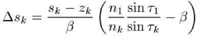 Dabei ist Δsk die Größe des Öffnungsfehlers, sk die paraxiale Schnittweite des Bildpunktes nach der k-ten Fläche, zk der Abstand der Austrittspupille von der k-ten Fläche, β der paraxiale Abbildungsmaßstab, τ1 der Winkel des Objektstrahles mit der Achse nach der 1. Fläche und τk der Winkel des Bildstrahles mit der Achse nach der k-ten Fläche. n1 und nk bezeichnen die Brechzahlen vor der 1. bzw. nach der k-ten Fläche. Anschaulich verlangt die Isoplanasiebedingung, daß die Änderung der Brennweite über die Öffnung hinweg dem Öffnungsfehler proportional ist. Eine Weiterentwicklung der Isoplanasiebedingung ist das Koinzidenzkriterium, zu dessen Berechnung lediglich die Flächenkoeffizienten der Fehlerrechnung dritter Ordnung herangezogen werden.