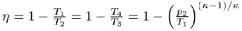 , (κ: Adiabatenexponent) ist niedriger als der des Carnot-Prozesses mit ηC = 1 – T1 / T3 und liegt in der Praxis zwischen 0,4 und 0,54.