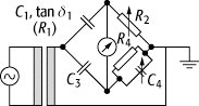 Kapazitätsmeßbrücke, eine Brückenschaltung zur Messung der elektrischen Kapazität (Abb.). Der auch Schering-Brücke genannte Aufbau bestimmt Kapazität C und Verlustwinkelδ eines Kondensators. Sie gehört zu den meistgebrauchten Hochspannungsbrücken zur Bestimmung dielektrischer Verluste. Wenn R2 und R4 winkelfehlerfreie ohmsche Widerstände und C3 ein verlustfreier Vergleichskondensator sind, dann gilt: C1 = C3R4 / R2 und tan δ1=ωC4R4 (ω = 2πν: Frequenz des Stromes).